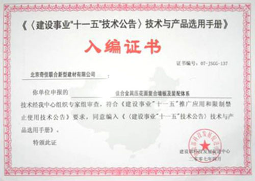 - 2007年被選入《建設(shè)業(yè)“十一五” 技術(shù)公告技術(shù)與產(chǎn)品選用手冊(cè)》